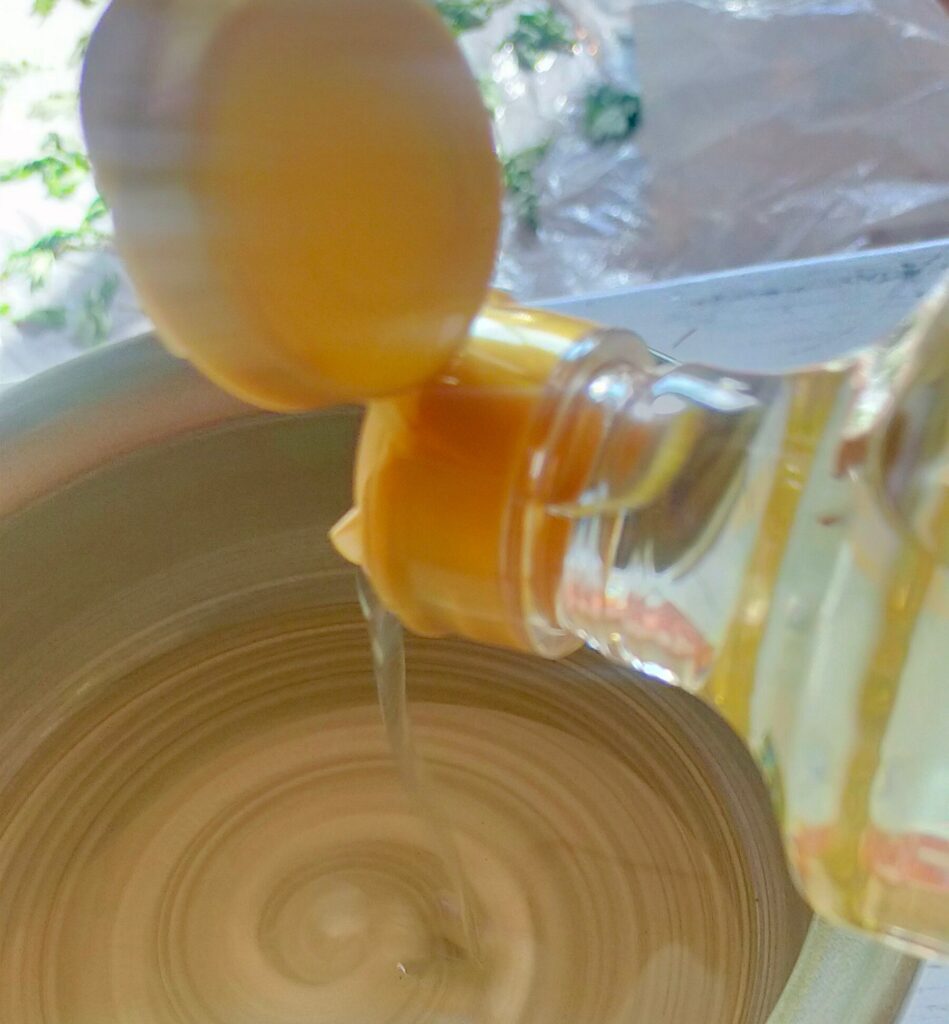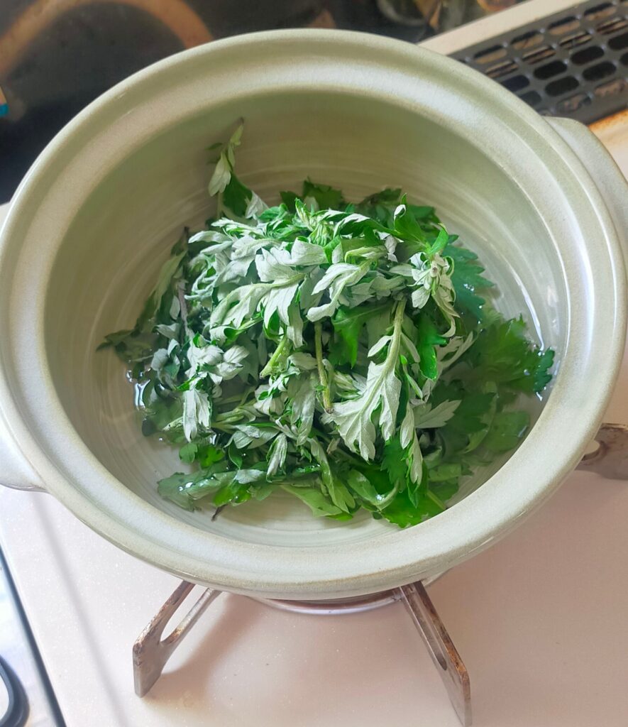 土鍋にヨモギの量の約1.2倍の太白ごま油を入れて